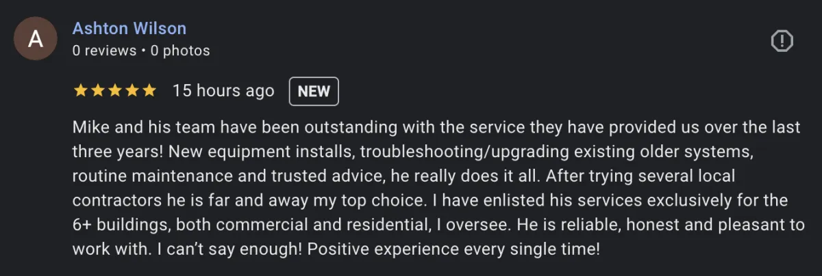 We just had two new heat pumps installed at our condo at Pacific Shores. Mike and his crew were fantastic from first contact to completion. On time on budget and did great job given difficult retro fit. Mike is a good listener and is completely focused on quality and customer service Would highly recommend them.